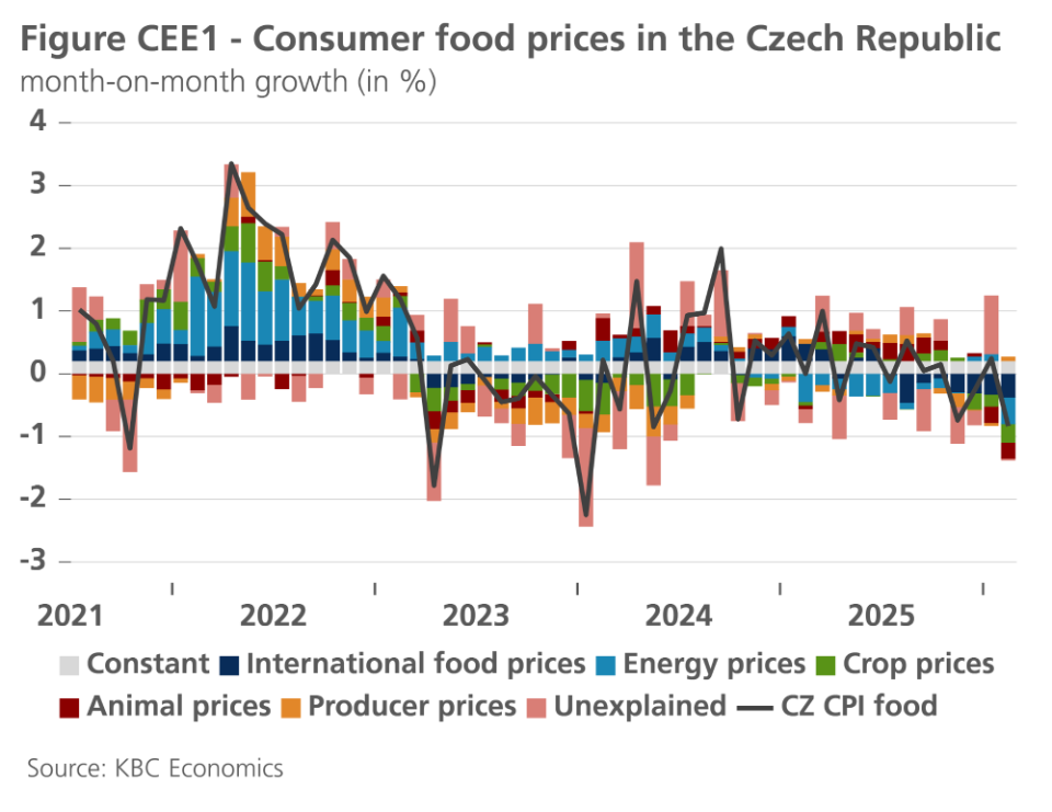 The Board’s reasoning has been centred on the “momentum of core inflation” particularly within the services sector, which remained stubbornly elevated at 4.3% year-over-year in February. While energy and food prices provided a significant downward pull, service sector costs driven by robust nominal wage growth continue to pose a risk. Food prices surprised many on the downside; however, given the recent downward trend in international food prices, government measures in the energy market, and observed declines in agricultural prices, this was broadly in line with our expectations (see Figure CEE1).1 Nonetheless, following the energy crisis, higher energy prices and fertilizer costs can be expected to pull food inflation away from its current downward trajectory. Given the recent increase in energy prices, we should consider the risk of an additional upward pressure of roughly 0.4% in monthly food price growth for the remainder of the year relative to a scenario without the energy shock. The CNB decision to hold rates in March reflects a broader strategy of "wait-and-see" regarding the government's fiscal trajectory and the strength of the koruna. We expect Czech average HICP inflation to reach 1.9% this year and 2.9% in 2027.