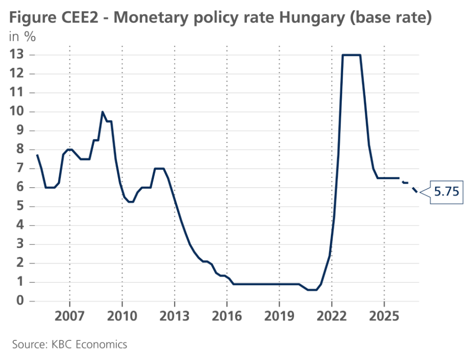 In February the MNB reduced the base rate by 25 basis points to 6.25%, marking the first cut in eighteen months (see figure CEE2). This policy shift was enabled by a sharp disinflationary trend: February 2026 inflation fell to 1.4%, confirming our nowcast, but undershooting market expectations and reaching an almost eight‑year low. We expect average Hungarian HICP inflation to reach 3.2% this year and 3.5% in 2027.