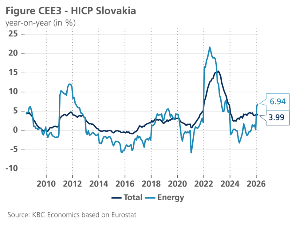 Slovakia’s inflation rate remains elevated compared to its peers, primarily due to the withdrawal of energy price ceilings and the impact of the VAT increase. In January, year-over-year inflation hit a four-month high of 4.3%, driven by a 25% surge in thermal energy prices. A month later, headline inflation decelerated slightly to 4% (see figure CEE3). We expect Slovak average HICP inflation to reach 4.1% this year and 3.1% in 2027.