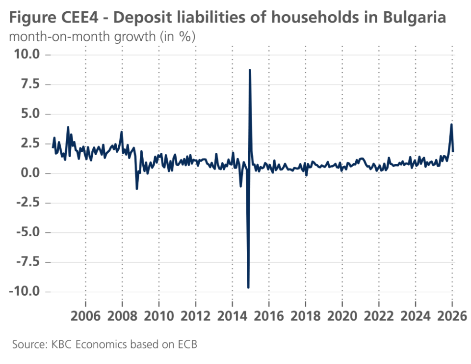 The first two months of 2026 have been a landmark period for Bulgaria, as the country successfully integrated into the euro area on January 1. By the end of the dual circulation period on January 31, 2026, the transition from the lev to the euro was deemed technically smooth. Bulgarian residents have continued to deposit lev cash for automatic conversion, leading to an acceleration in the growth of non-government sector deposits (see figure CEE4). By mid-March 2026, 89% of the total lev cash in circulation had been withdrawn from the market. To allay public concerns about price gouging, the authorities have maintained a rigorous monitoring regime, with the mandatory dual display of prices scheduled to continue until August 2026.