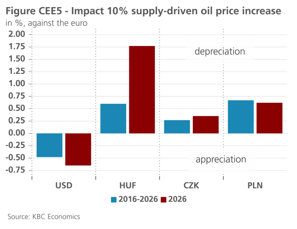The energy supply shock has a major impact on currencies worldwide. Figure CEE5 shows impulse response functions of exchange rates on the day of impact to a negative oil supply shock.2 For the USD, higher oil prices increase demand for the dollar, given the US's status as a net energy exporter, resulting in appreciation against the euro. The estimated median response shows a 0.5% USD appreciation for a 10% oil price increase. This mechanism was one of the important drivers of dollar appreciation in 2026. For CEE currencies, which belong to energy-importing economies, the estimates show additional depreciation against the euro, reflecting higher energy pass-through to CPI and the market's assessment of central banks' ability to manage inflationary pressures. The additional depreciation is around 0.25% for the Czech koruna and 0.65% for the Hungarian forint. Risk-off mechanisms may add further pressure.