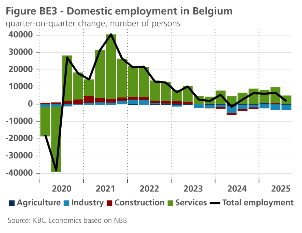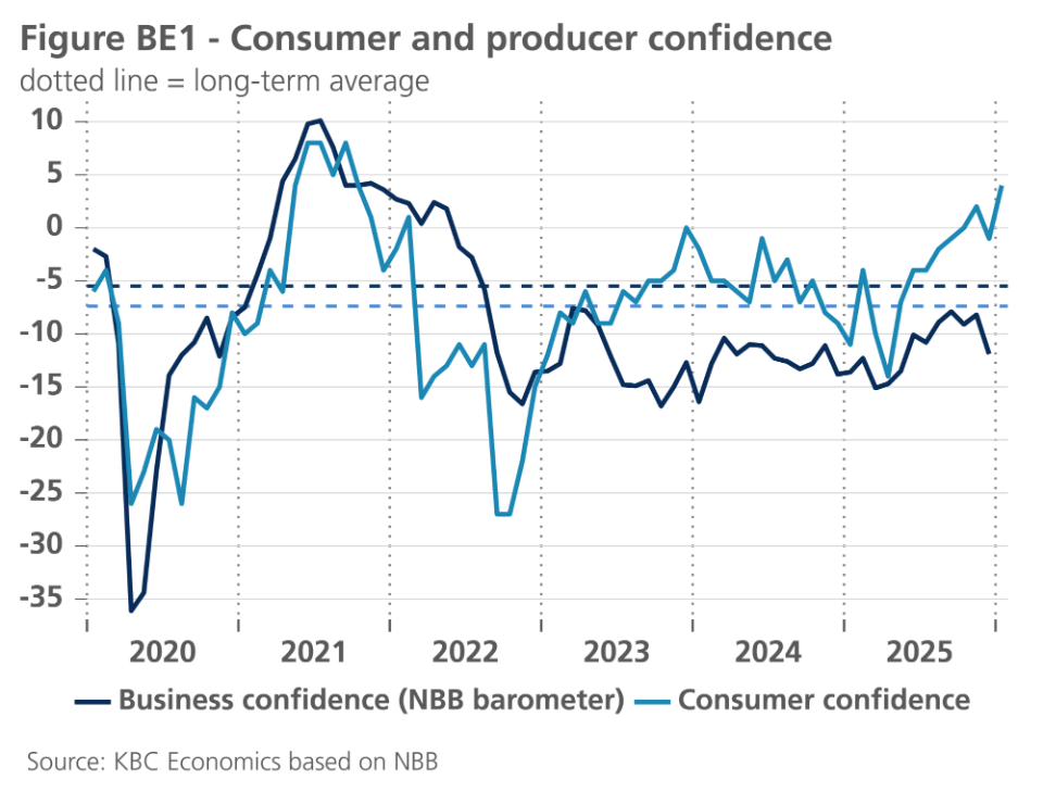 We decided to not change the outlook for Belgian real GDP growth. After an estimated average growth of 1.0% in 2025, we see Belgian growth at 1.1% and 1.3% in 2026 and 2027, respectively. This is a scenario in which effective GDP growth in Belgium gradually converges to its potential rate (estimated by the EC at 1.4% in 2027). The risks surrounding this scenario are quite large, though, and are tilted to the downside. These include a delayed impact of US tariffs, or even worse an escalation of the trade war, a less resilient labour market, and the new government measures exerting downward pressure on purchasing power and consumption growth.