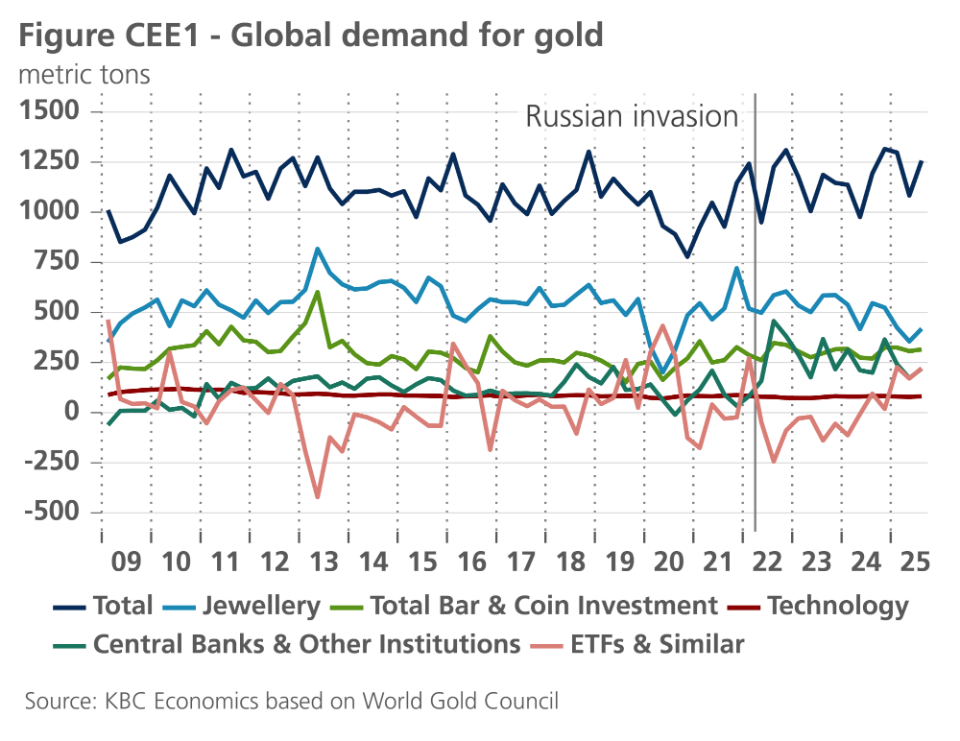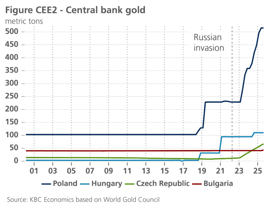 The Czech Republic began building its gold reserves in 2023 (see figure CEE2). The central bank aims to accumulate 100 tonnes of gold and has already reached two thirds of this target. It follows a conservative strategy and does not speculate on price. Instead, it purchases gold gradually, applying the “averaging effect”. This method is used by investors to build large portfolios while reducing the risk of poorly timed acquisitions. This explains why Czech gold purchases continued in the third quarter of this year despite elevated prices.