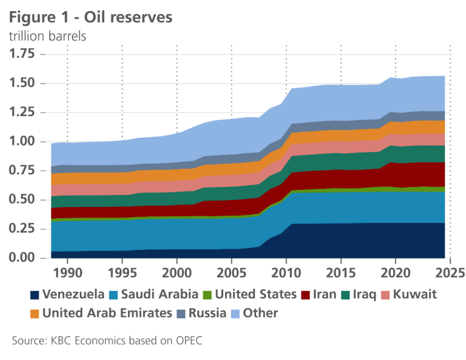 Venezuela has significant proven oil reserves (see figure 1). However, its oil production has dropped sharply from a peak of 3.5 million barrels per day in 1998 (5% of global production) to around 1 million barrels per day (less than 1% of global production). The current turmoil could lower oil production further in the short-term. However, given current oversupply, oil markets could easily absorb a reduction in Venezuelan oil output. In the longer run, the potential for a lifting of US sanctions and larger involvement by US oil majors could cause an important positive oil supply shock. Yet, the high extraction cost of Venezuelan oil, along with the decrepit state of Venezuelan oil infrastructure and still elevated uncertainty, may deter investment in Venezuela. Nonetheless, in anticipation of higher Venezuelan output, the futures curve flattened, with prices decreasing on the longer end of the curve.