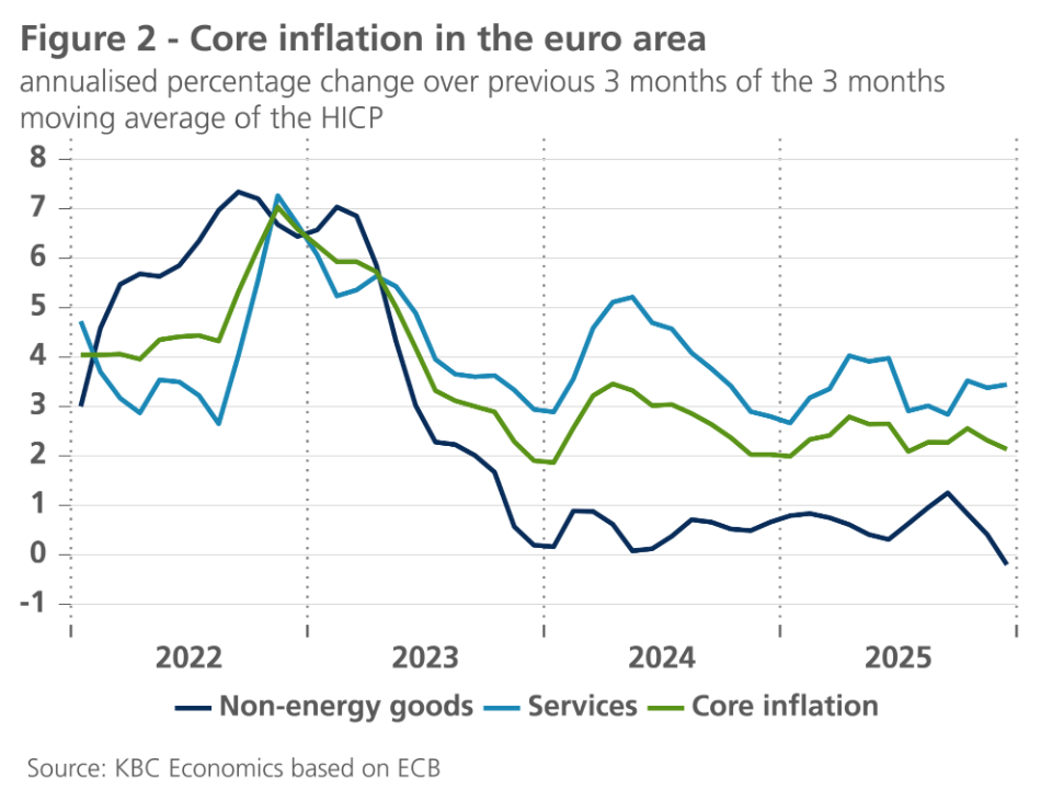 Inflation thus appears to be back on track for cooling. However, this remains mainly due to erratic movements in energy prices. Core inflation, on the other hand, remains stubborn. Since May 2025, core inflation has consistently been 2.3% or 2.4%. The breakdown of short-term dynamics of core inflation shows that after a temporary surge during the summer months, goods inflation cooled down sharply in the last quarter. But for services inflation, the momentum in the last months of 2025 was even slightly stronger than during the summer months (see figure 2).