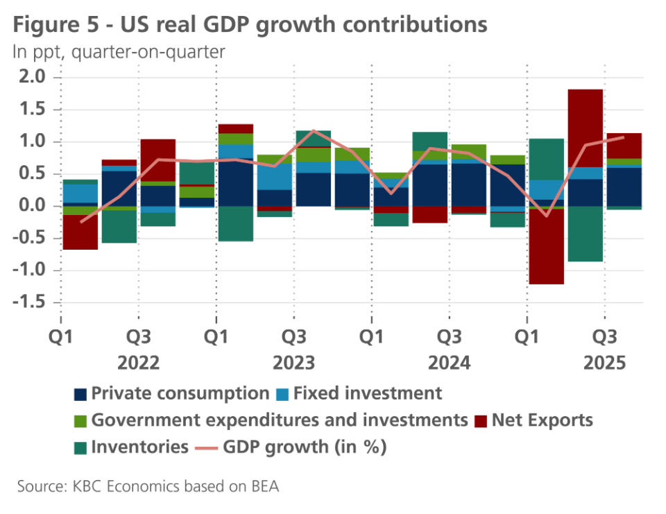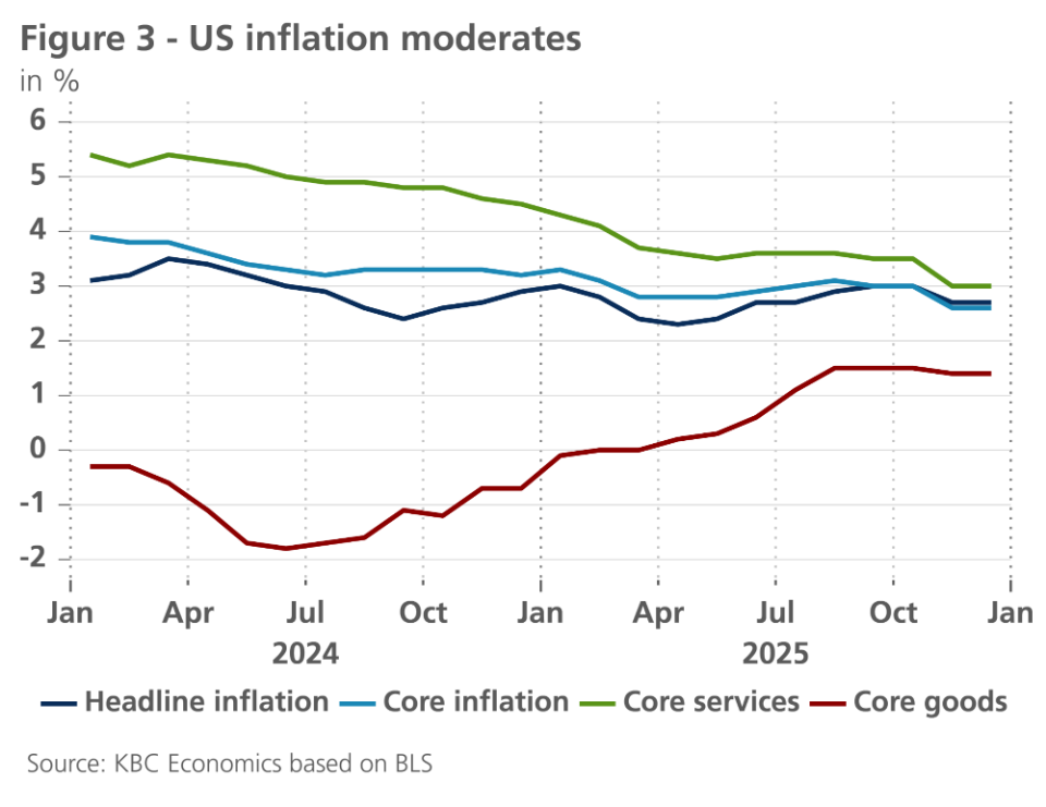 The global economy is showing resilience in the face of the increased geopolitical risks and higher tariffs. This is especially visible in the US, where the Q3 growth figure reached an elevated 1.1% quarter-on-quarter. Growth is likely to remain robust in Q4, given strong export growth, decent demand and strong non-residential investments. The unemployment rate also remains under control for now, which together with still strong inflation, will keep the Fed on hold in January. We also slightly upgraded our outlook for China, given stronger industrial production and export resilience. The real estate market and weak domestic demand, however, remain important points of concern. In the euro area, the latest confidence indicators still point to a tepid growth outlook. German budgetary stimulus could spur a gradual improvement in growth dynamics in 2026, however.