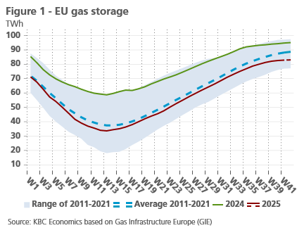 Lower tensions in the Middle East also relieves pressure on natural gas prices. European natural gas prices remained broadly unchanged last month, finishing at 31 EUR per MWh. The market remains well supplied as American LNG is imported at record levels. Gas reserves remain somewhat below historical averages, however (see figure 1).
