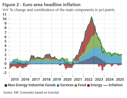 However, with 2.2% headline and 2.3% core inflation, the inflation rate is still slightly above the European Central Bank's (ECB) medium-term target. A look back at the contribution of the main components to inflation shows that the contribution of services in particular is still significantly higher than in the three years immediately preceding the pandemic and the subsequent energy price shock. The contribution of non-energy goods and food is also slightly higher than it was then, but to a lesser extent. Given their lower weight in the consumer price index, this is less important, especially since inflation in 2017-2019 remained stubbornly below the ECB's target: 1.5% on average and even only 1.0% for core inflation. Slightly higher inflation than at that time therefore seems desirable, at least from the perspective of the ECB's target. However, the current pace of services inflation – which has by far the largest weight (45.6%) in the consumer price index – is not compatible with that target.