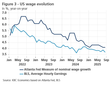 Core PCE inflation remained unchanged at 2.9%. Core goods inflation remained unchanged at 1.1%, thus showing limited evidence of tariff passthrough. Core services inflation also stabilised. We might see some softening in this category in the months ahead, given declining wage pressures (see figure 3). Given that PCE inflation was in line with expectations, we keep our inflation forecasts unchanged at 2.8% this year and 2.6% next year.