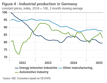 We are thus still waiting for clear signs of a (strong) economic recovery. Against this backdrop, the significant deterioration in sentiment among both businesses and consumers in France is noteworthy. The political malaise risks taking a toll on the country’s economy. Meanwhile, German industrial indicators remain disappointing as production continues to trend downward. In energy-intensive sectors, it recently fell to more than 20% below the 2018 average, while the recovery in car production in the first half of 2025 currently appears to be stalling (see figure 4). It is also discouraging that, after the improvement in the first half of the year, German business expectations for the next six months are once again gloomy, not only in the manufacturing industry, but in virtually all sectors with the exception of construction.