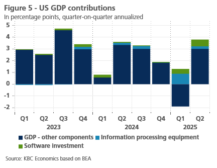 The strong Q2 and Q3 figures seem to indicate that the protectionist US policies are only having a limited impact on US growth. Yet a closer look at the data suggests that the high growth figures are partially driven by a strong AI boom. Indeed, if we exclude AI-related components (i.e. information processing equipment and software investment) H1 GDP growth would drop from 1.6% to 0.55% in annualised terms (see figure 5).