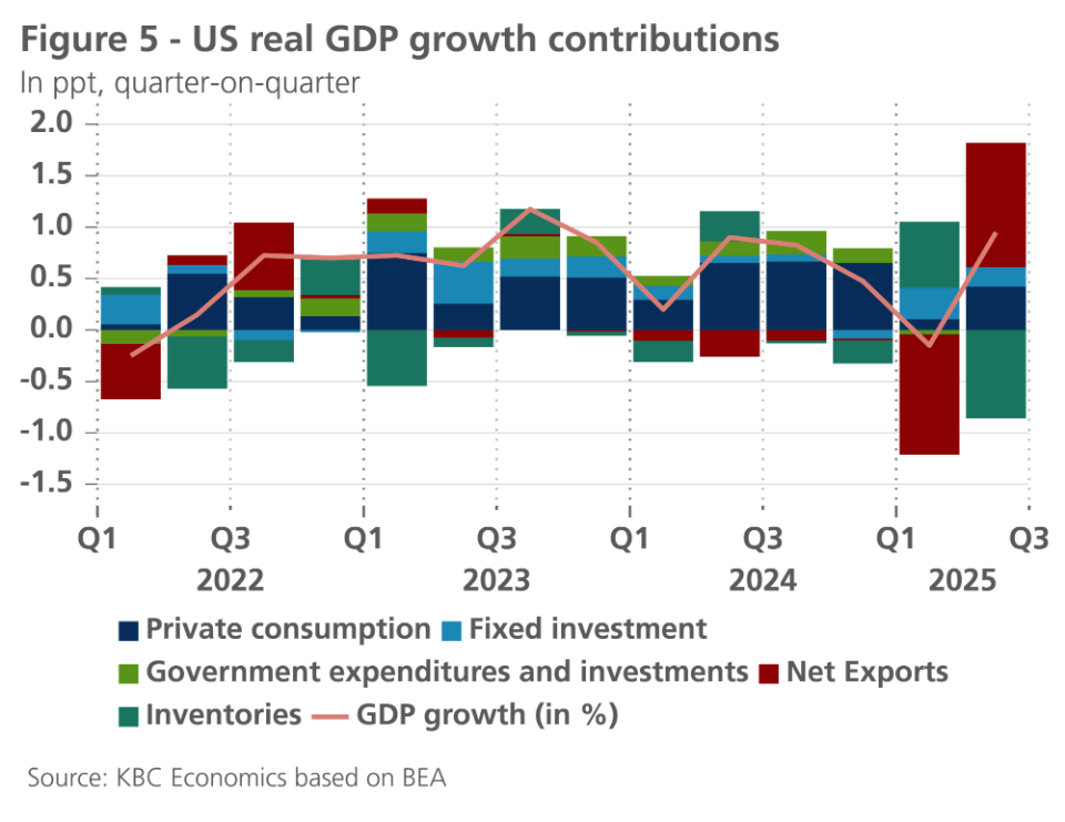 The US economy is withstanding the pressure from higher tariffs for now. Q2 GDP has been revised upwards to 0.95% quarter-on-quarter (see figure 5). There was a large upward revision to non-residential investments. Within this category, the large increase in software investment (6% quarter-on-quarter) was notable, as it could be an indication of more rapid uptake of AI software services. Personal consumption expenditures were also significantly revised upwards. The upward revisions were partly compensated by downward revisions of government spending and net exports.