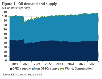 Oil prices declined by 6% to 67 USD per barrel last month. The decline is caused by continued elevated oil supply. OPEC+ recently announced another increase of its combined production quota by 137k barrels from October onwards. This comes on top of earlier increases in the production quota this year. Since May, OPEC+ will have lifted their production quota by almost 2.5 million barrels per day. On top of increased OPEC+ supply, non-OPEC+ countries are also ramping up supply. Output from the US, Brazil, Canada, Guyana and Argentina, in particular, is close to or at all-time highs. The International Energy Agency (IEA) now expects supply to increase by 2.7 million barrels per day (see figure 1). In contrast, oil demand is expected to grow by 700k barrels per day. This leaves the market in oversupply and allows for solid global inventory growth. The IEA expects this oversupply to be maintained in 2026. The current oversupply in the market explains why recent geopolitical events, such as the tightening of sanctions on Russia and Iran and the Israeli strike on Hamas leadership in Qatar, have only had a limited impact on oil prices.