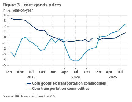 The motivation for resuming the easing cycle, despite stubbornly high and even slightly rising core inflation, was the increased downside risks to the US labour market. Fed chairman Powell called it a "risk management cut”. Indeed, it looks increasingly likely that the inflation boost from import tariffs will be temporary (at least according to market expectations), and that longer-term inflation expectations remain anchored around the Fed's 2% target. This is reflected in the dot plots by an increase in expected inflation in 2026, with a decline to near the inflation target in 2027. Weaker monthly job growth and a slowly rising unemployment rate then tilted the Fed's risk trade-off in favour of a limited move of 25 basis points in the direction of neutral. Relative to June's 'dot plots', this accelerates the Fed's downward path of its policy rate to neutral until 2027, but we assume it will occur even sooner. Indeed, according to our forecasts, the most likely scenario is that the Fed has effectively started an easing cycle in steps of 25 basis points for each of the following policy meetings, which will bring the policy rate to its expected bottom of 3.125% by the end of Q1 2026.