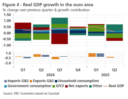 Real GDP growth in the euro area in the second quarter of 2025 reached 0.1% quarter-on-quarter. This is a significant slowdown compared to growth in the first quarter (0.6%). In Q1, growth received a powerful boost from exports to the US in anticipation of higher import tariffs. The downside was that exports of goods and services fell by 0.5% in the second quarter, while imports remained broadly unchanged. This resulted in a strongly negative contribution of net exports. This was not offset by final domestic demand. Growth in private consumption remained extremely weak at 0.1%, while investment in fixed assets actually fell by 1.8%. Only public consumption recorded fairly solid growth (0.5%). Ultimately, strong inventory build-up prevented real GDP growth from turning negative (see figure 4).