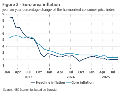 According to the final estimate, inflation in the euro area remained at 2.0% in August. This means that, for the third month in a row, it was exactly in line with the ECB's target (see figure 2). However, core inflation (inflation excluding food and energy) remained at 2.3% for the fourth consecutive month. While the cooling of services inflation in recent months has been slow (from 3.2% in May to 3.1% in August), the rate of price increases for non-energy goods picked up slightly (from 0.6% in May to 0.8% in August). Food prices in August were 3.2% higher than a year earlier. It is therefore the 2% year-on-year fall in energy prices that has kept headline inflation down to 2%.