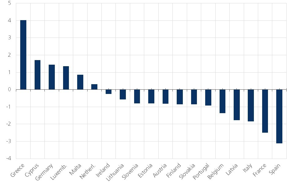 In the most recent update of its economic outlook, the OECD points out that better coordination of macroeconomic policies in the euro area would increase the effectiveness of monetary policy. The institution advocates complementing the ECB’s low interest rate policy with a temporary stimulus through the government budgets of those countries that have the room to do so. It envisages a three-year public debt-financed investment programme amounting to 0.5% of GDP annually in Germany, the Netherlands, Austria, Ireland, Finland, Slovakia, Slovenia and the Baltic States. These are countries with a structural budget surplus or only a small deficit (Figure 1). All euro-area Member States should simultaneously promote structural reforms. In 2019 and 2020, this would stimulate euro area growth by a quarter of a percentage point. In the longer term, economic output would be a full percentage point higher. The IMF and the ECB previously published studies with similar conclusions.