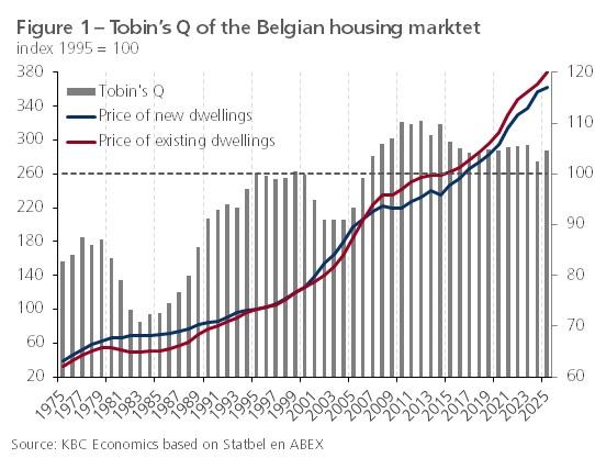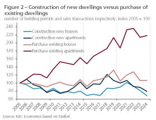 Figure 1 shows that, over the past few decades, the Tobin's Q of the Belgian housing market has fluctuated somewhat over short time horizons. Within the past two decades, the years after 2004 are particularly noteworthy: existing housing became relatively more expensive than new housing, which, only after some time, resulted in additional investments in new housing units and in prices for both categories of housing coming back into sync. Initially, these residential investments mainly involved apartments and only later also more houses (figure 2). Compared to many other European countries, the adjustment process of the new housing market in Belgium is rather slow, which is due to the high population density, leading to land scarcity, and to the relatively heavy regulations on land use planning and procedures for obtaining a building permit.