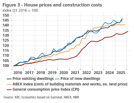 Since 2016, the prices of existing and new dwellings in Belgium have again followed a parallel course. For both housing categories, price dynamics have picked up sharply since then. Between the start of 2016 and the end of 2025, the prices of existing and new dwellings rose by 46.0% and 47.4% respectively. It is noteworthy that this price boom was accompanied by a sharp increase in the cost of new construction (figure 3). The ABEX index, which reflects the cost of building materials and works, rose stronger (+40.8%) than the general consumer price index (+32.9%) since the beginning of 2016. The development is linked to new requirements for new buildings (in terms of energy performance and safety) and more expensive building materials.