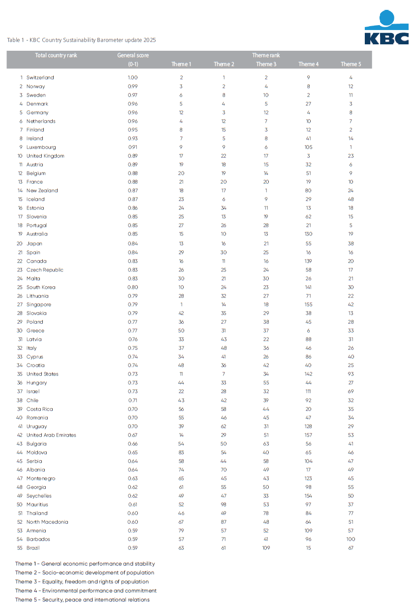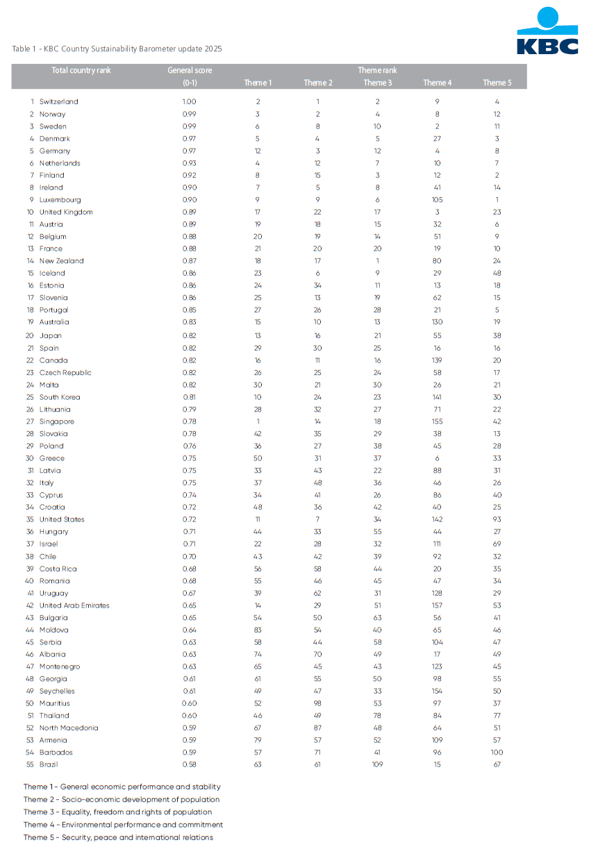 Sustainability forms an integral part of KBC Group’s general business strategy. The KBC Country Sustainability Barometer supports this strategy by providing a key input for the Responsible Investing (RI) funds offered by KBC Asset Management. Responsible investment in government bonds requires additional analysis, just as it does with equities and corporate bonds. This amounts to ‘country screening’ or, more specifically, analysis of the importance that national governments attach to sustainability and social responsibility in their policies. We begin this research report by sketching out what ‘sustainability of countries’ entails. We then look at the way in which countries can be analysed for sustainability. In doing so, we examine the yardstick that KBC Economics has developed for its Sustainability Barometer. We briefly discuss the screening methodology and the five themes used in the scoring model. Finally, we discuss the results of our most recent calculations (the 2025 update of the KBC Sustainability Barometer).