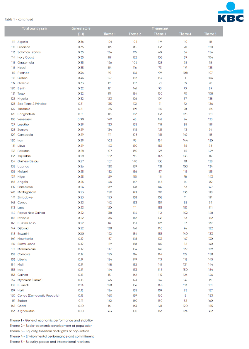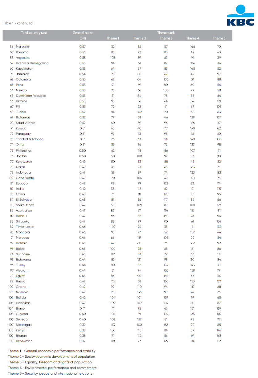 The second stage then moves to the theme level. The values for each sub-indicator, calculated in the previous step, are averaged together (again with equal weighting) and then standardised to a value between zero and one. The best performing country again gets a value of one and the worst performing a value of zero. If a value for one of the sub-indicators is missing, the raw theme score is calculated without that sub-indicator. If a country has data for less than 80% of sub-indicators (i.e., if three or more of the fifteen sub-indicators are missing) the country is excluded from the calculations. In the final third stage, we calculate the average of the standardised scores for the five themes (again with equal weighting). By standardising that average between zero and one, we obtain the KBC Country Sustainability Barometer.