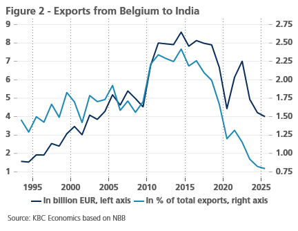 Belgium is among the EU countries where the expected impact is relatively high. This reflects Belgium's relatively large exports to India (as a % of GDP) compared to most other countries. Relative to total exports, India is a small, but not insignificant, trading partner for Belgium. In 2025, India's share was 0.8% of total exports (about EUR 4 billion). This makes India Belgium's 18th most important export market. After the US, China and Turkey, India is Belgium's 4th most important trading partner outside Europe. India's importance in exports did decline significantly over the past decade (see figure 2), mainly due to the sanctions on Russian diamonds, which accounted for a third of Belgium's rough diamond imports before the sanctions took effect. This greatly affected the supply of rough stones to Belgium, which traditionally went from Antwerp to India. Along with diamonds (the tariff on processed diamonds going from 5.5% to 2.5%), chemicals (for which the current 22% tariff will be largely abolished immediately) and machinery and equipment (for which the tariff now rising to 44% will be gradually but significantly reduced) accounted for almost two-thirds of total Belgian exports to India in 2025. Their respective shares were 37%, 16% and 10% in 2025.