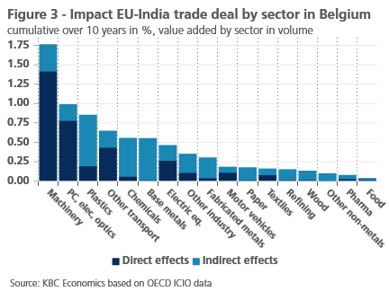 After nearly 20 years of negotiations, the EU and India sealed a free trade agreement on 27 January 2026 in New Delhi. The bilateral deal creates one of the largest free trade areas in the world and embraces nearly two billion consumers. The agreement provides for extensive liberalisation of import tariffs. The EU abolishes tariffs on 90% of tariff lines (91% in terms of trade value). India will do so on 86% of tariff lines (93% in terms of trade value). In addition, both sides will partially liberalise some more tariff lines, bringing the total coverage of trade liberalisation to 99.3% for the EU and 96.6% for India. In this Economic Brief, we estimate the (direct and indirect) impact of the deal on EU economies. For Belgium, which is among the countries where the expected impact is (relatively speaking) high, we also make a sectoral quantification.