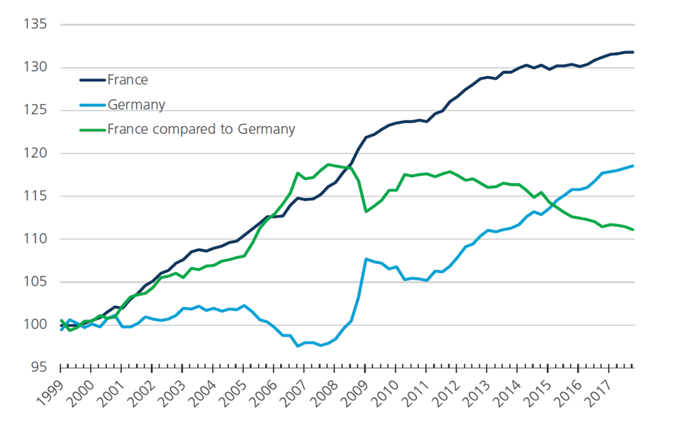 To get Germany onside, it is very much in Macron’s interests to bolster French competitiveness. He now faces the major challenge of persisting with pay moderation and implementing his economic reform agenda. Conversely, Merkel’s plea for competitiveness would also gain credibility if she were to focus German policy more on modernising the economy. This will require her to ratchet up investment, given that German budget and current account surpluses not only reflect the country’s strong competitiveness, but also an unduly low level of investment. Investment in Germany has increasingly lagged that in France in recent decades (Figure 2). With populism on the rise, it will be a challenge for the weakened German government to channel these surpluses primarily into a structural reinforcement of German growth rather than into less productive consumer spending. But this is necessary not only for Germany, but also for the entire euro area – stronger German growth would, after all, trickle through to other countries too, making their own structural reforms that much easier.