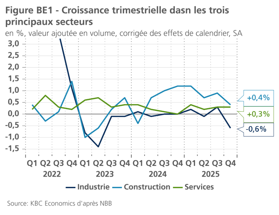 L'estimation rapide de la croissance belge au dernier trimestre 2025 est ressortie à 0,2% en glissement trimestriel. Ce chiffre est légèrement inférieur à ce que nous attendions et signale une légère décélération par rapport à la croissance de 0,3% enregistrée en moyenne au cours des trois trimestres précédents. La croissance du quatrième trimestre a été inférieure à celle de la zone euro (+0,3%) et a été tirée par l'activité dans les services (+0,3%) et la construction (+0,4%), tandis que l'industrie a enregistré une croissance négative (-0,6%) (voir figure BE1). Pour l'ensemble de l'année 2025, la croissance du PIB en volume a ralenti à 1,0%, contre 1,1% en 2024. La ventilation des composantes du quatrième trimestre n'a pas encore été publiée, mais les détails des trois premiers trimestres indiquent déjà que la croissance de 2025 a été soutenue par la demande intérieure finale (la consommation privée en particulier) et les variations de stocks, tandis que les exportations nettes ont été un frein. Après avoir connu trois années consécutives de croissance plus forte, la Belgique n'a plus fait mieux que la zone euro en 2025, où la croissance annuelle s'est élevée à 1,5%. Dans une perspective à plus long terme, l'activité économique en Belgique au 4e trimestre 2025 était supérieure de 8,5% à son niveau d'avant la pandémie (4e trimestre 2019), contre 7,3% dans la zone euro.