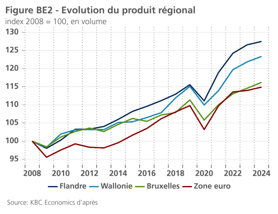 En 2024, année pour laquelle l'Institut des comptes nationaux (ICN) a récemment publié des données sur la croissance régionale, la croissance de la Flandre était déjà fortement affectée par la faiblesse de l'industrie. Cette année-là, la Flandre n'a enregistré qu'une croissance économique générale de 0,7%, contre 1,2% et 1,4% en Wallonie et à Bruxelles, respectivement. Un an plus tôt, en 2023, la croissance dans trois régions était de 1,9% (Flandre), 1,8% (Wallonie) et 1,4% (Bruxelles). C'est donc en 2024 que la Flandre a connu le ralentissement le plus prononcé. Dans une perspective plus longue, la croissance en Flandre depuis 2008 reste néanmoins supérieure à celle des deux autres régions (voir figure BE2).