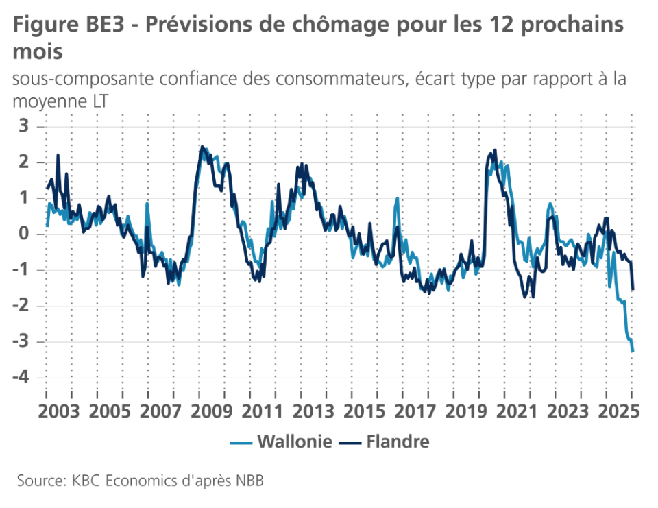 La hausse de la confiance des entreprises et des consommateurs en janvier a compensé la forte baisse enregistrée au cours du dernier mois de 2025. Le climat s'est redressé dans tous les secteurs étudiés, à l'exception des services aux entreprises. Dans l'industrie, le rebond est dû à une évaluation plus optimiste des carnets de commandes (totales et à l'exportation). L'utilisation des capacités dans ce secteur a toutefois légèrement diminué. Dans l'enquête auprès des consommateurs, les attentes en matière de chômage ont encore baissé, l'indicateur atteignant un niveau historiquement bas en Wallonie (voir figure BE3).