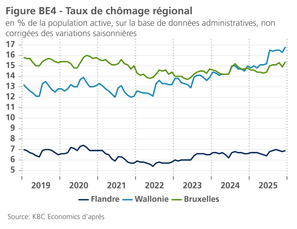 Les personnes interrogées, en particulier en Wallonie, pensent que le chômage diminuera à la suite de la décision politique de limiter la durée des allocations de chômage. Cela contraste avec l'évolution récente des taux de chômage régionaux (basés sur des données administratives). Alors qu'une hausse du taux au second semestre 2025 a été observée dans les trois régions, elle a été plus prononcée en Wallonie (voir figure BE4). Le taux de chômage de la Belgique (basé sur la définition harmonisée d'Eurostat) a également augmenté au second semestre 2025, passant de 6,0% en juillet à 6,4% en décembre. Sur l'ensemble de l'année 2025, le taux harmonisé s'est élevé en moyenne à 6,2%, contre une moyenne de 5,7% en 2024.