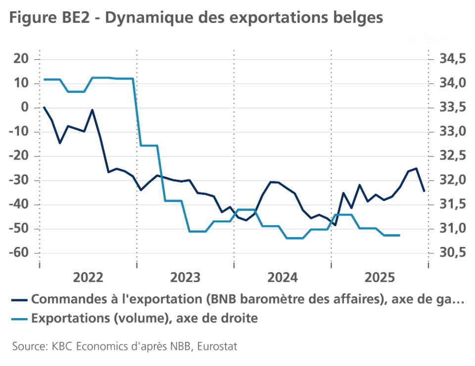 La détérioration du climat en décembre pourrait en partie résulter de l'accord sur le cadre budgétaire pour 2026-2029, conclu par le gouvernement fédéral fin novembre, qui comprend plusieurs mesures fiscales. Étant donné que le climat dans l'ensemble de la zone euro s'est également détérioré, le climat international toujours difficile explique plus probablement le retournement de la confiance en Belgique. Dans ce contexte, la forte baisse des carnets de commandes à l'exportation en décembre pourrait bien être une première indication de l'impact des droits de douane américains sur les exportations belges (voir figure BE2).