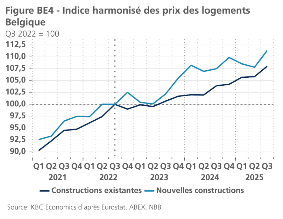 Début janvier, Eurostat a publié des données harmonisées sur les prix des logements pour le troisième trimestre 2025. Les prix ont augmenté de 1,6% par rapport au trimestre précédent dans l'ensemble de l'UE, soit le même taux qu'au deuxième trimestre. La hausse trimestrielle des prix a été la plus forte (plus de 4%) en Lettonie, en Slovaquie et au Portugal. Cinq pays ont enregistré une baisse des prix (Suède, Estonie, Slovénie, Finlande et Luxembourg). En Belgique, les prix de l'immobilier ont fortement augmenté de 2,4% en glissement trimestriel au troisième trimestre, après une légère baisse de 0,1% au deuxième trimestre. Les prix des logements neufs (+3,3%) ont augmenté un peu plus que les prix des logements existants (+2,1%) (voir figure BE4). Alors que les chiffres du deuxième trimestre ont quelque peu tempéré le rythme des hausses de prix précédentes, les données du troisième trimestre indiquent clairement que la dynamique des prix des logements se renforce à nouveau. Les données du troisième trimestre nous ont amenés à réviser nos perspectives de croissance des prix de l'immobilier belge en 2025 et 2026 à une moyenne annuelle de 3,3% et 3,4%, respectivement, contre 2,6% et 3,1% précédemment.