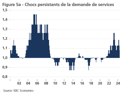 Les chocs de demande persistants posent-ils un problème? D’un point de vue comportemental, les agents économiques peuvent en venir à considérer certains chocs comme la nouvelle normalité. Par exemple, un consommateur ou une entreprise peut s’attendre à tort à ce qu’après un choc de demande positif, l’économie continue à fonctionner à ce niveau élevé, de sorte que l’agent ajuste son comportement et crée un nouveau choc de demande. Par exemple, la consommation ou l’embauche est supérieure à ce que la situation économique future de l’agent permettra. Ainsi, des chocs de demande positifs non aléatoires peuvent refléter une bulle dans l’économie. Cela peut conduire à des chocs de demande négatifs (importants) à l’avenir. Devons-nous craindre un tel scénario après une période de persistance historiquement élevée de chocs de demande principalement positifs?