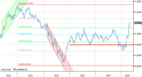 Le cours EUR/GBP est sur le point de s’envoler. D’un point de vue technique, la paire de devises évolue depuis cet été dans une configuration triangulaire symétrique. C’est le type de modèle de consolidation qui constitue généralement une interruption temporaire de la tendance existante, en l’occurrence à la hausse. Le cours EUR/GBP confirme actuellement la théorie du dépassement du plafond. Les récents sommets de fin septembre ont également été atteints autour de 0,875. Tous les regards sont désormais tournés vers le sommet de juillet à 0,8769. Nous privilégions une fraction plus élevée. À partir de ce moment-là, la voie est en principe dégagée vers 0,8868 (61,8 % de reprise EUR/GBP par rapport à la baisse de 2022-2024) et la zone symbolique de 0,90.