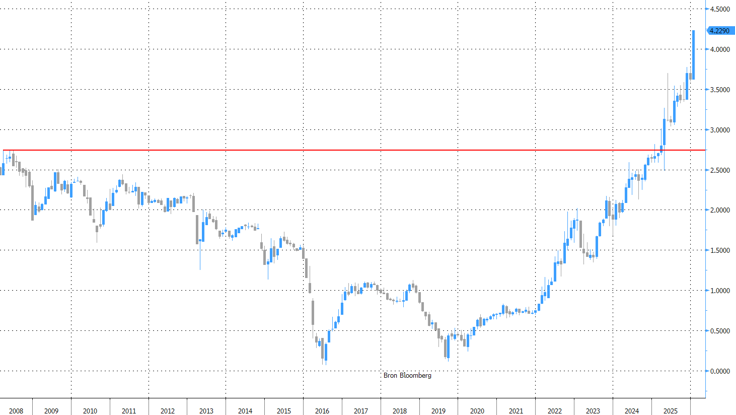 Comme indiqué, la vague de ventes d’obligations à long terme ne se limite pas au Japon. D'autres pays connaissent évidemment aussi des problèmes budgétaires similaires. On remarque ici à quel point la fonction de réaction de rejet du risque ("risk-off") des marchés a changé à une vitesse fulgurante. Dans un passé pas si lointain, les obligations d’État à long terme faisaient office de valeur refuge en période d’incertitud.e. Aujourd'hui, elles font partie du problème, voire elles en sont à l'origine. Les doutes autour des politiques budgétaires constituent une partie de l'explication. Mais nous ne pouvons nous défaire de l'impression qu'il y a autre chose derrière tout cela.L'incertitude générale croissante n'aide pas à prendre des engagements sur le long terme. La prime Takaichi est peut-être aussi en partie une prime d’incertitude Trump. Dans ce contexte, il est également frappant de constater que le dollar n’e gagne pas de terrain par rapport au yen et que des devises comme l’euro et le franc suisse se portent bien. Nous ne tirons pas encore de conclusion, mais nous regardons avec plus d'intérêt que d'habitude quelle devise se montre la moins sensible à la hausse générale des primes de risque.