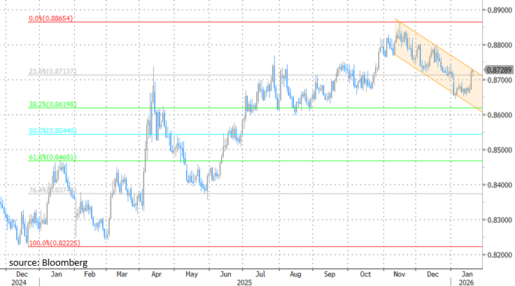 Lors des précédentes réunions de politique, le gouverneur Bailey a toujours eu le vote décisif au sein du comité de neuf membres. En décembre, il s’est ainsi décidé en faveur du sixième abaissement de taux seulement depuis le début du cycle de normalisation en août 2024. À 3,75%, le taux directeur se rapproche progressivement de ce qui est considéré comme un taux d’équilibre (3-3,5%). Autrement dit, la marge de manœuvre est bientôt épuisée, surtout à la lumière d’un marché du travail résilient et d’une inflation trop élevée. Le mois dernier, la BoE a elle-même indiqué que de futurs abaissements n’étaient pas garantis. Une déclaration qui vaut ce qu’elle vaut, bien sûr, face à la possibilité d’autres tarifs douaniers imposés par les États-Unis. Pour l’instant, nous prévoyons encore un abaissement au deuxième trimestre de cette année, quand la BoE examinera les mesures d’atténuation du coût de la vie annoncées par la chancelière de l’Échiquier Reeves à l’automne dernier. En ce qui concerne la livre sterling, la politique monétaire joue un rôle secondaire. Hier, les tensions géopolitiques et l’aversion au risque qui l’accompagne, de même que la résurgence de la bête noire de la livre – les primes de risque de crédit – ont poussé la paire EUR/GBP vers un premier niveau de résistance proche de 0,87. L’affaiblissement de la livre reste notre scénario de base. Si le cours EUR/GBP échappe au canal baissier, cela impliquerait un retour au sommet annuel de 2025 de 0,886.