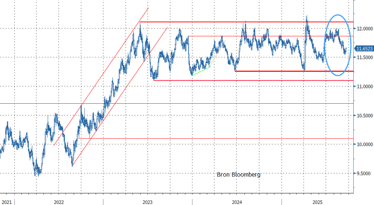 Hier, la couronne a légèrement perdu du terrain en cours de journée. Mais c’était plutôt dû au contexte général du marché (hausse des taux dans les pays du noyau dur; baisse intraday des prix du pétrole) qu’à la décision de la banque centrale. Dans une perspective un peu plus longue, la paire EUR/NOK tombe pile au milieu du modèle de consolidation (11,09/12,22) qui s’impose au marché depuis le printemps 2023. Contrairement à la livre sterling, par exemple, le taux directeur élevé norvégien ne se justifie pas uniquement par une inflation excessive. La croissance pourra le supporter. Par ailleurs, le caractère structurellement élevé de l’inflation et du taux de change effectif réel menace de nuire à la compétitivité. Pour la NB, le NOK pondéré des échanges commerciaux (indice I-44) est déjà stable sur l’horizon de politique. Soutenue par un taux directeur réel (attendu) toujours positif d’environ 1% (base CPI-ATE – soit l’indice des prix à la consommation corrigé des changements fiscaux et excluant les produits énergétiques), la couronne pourrait, si le sentiment constructif vis-à-vis du risque persiste, se renforcer (baisse EUR/NOK) dans la fourchette susmentionnée. EUR/NOK 11,40 et 11,26 sont les premiers niveaux de résistance.