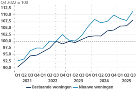 La dynamique annuelle, moins volatile que les variations trimestrielles, s’est considérablement accélérée depuis fin 2023 et s’est établie à 5,5 % (légèrement au-dessus) au cours des trois premiers trimestres de 2025. À l'échelle de l’UE, les prix des logements ont terminé le troisième trimeste 2025 8,4 % au-dessus du pic qu'ils avaient enregisté au troisième trimestre 2022, moment à partir duquel le marché avait commencé à s'essouffler. En Belgique, la différence s’éleve à 8,5 %, soit une évolution comparable à celle observée sur l'ensemble de l'UE. Par rapport à l’UE, la Belgique a connu, d’une part, un ralentissement plus modéré du marché et, d’autre part, un rebond moins prononcé des prix au cours des derniers trimestres. Derrière l'évolution générale des prix au cours de la période citée se cache une divergence entre les logements existants et les logements neufs. Entre le troisième trimestre 2022 et le troisième trimestre 2025, les prix des biens existants ont grimpé de 8 % et ceux des nouveaux de 11,3 % (voir le graphique). Dans l’UE, ces chiffres se sont élevés à respectivement 6,3 % et 17,1 %. Au troisième trimestre 2025, les prix des logements existants et neufs en Belgique ont progressé de respectivement 2,1 % et 3,3 % par rapport au trimestre précédent (1,6 % pour les deux dans l’UE).
