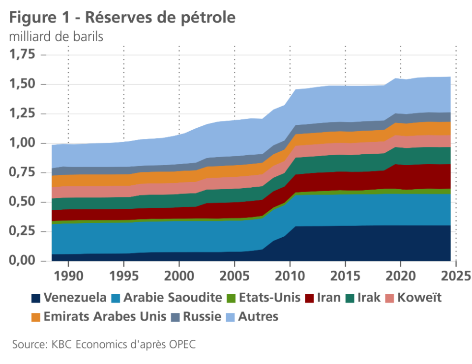 Le Venezuela dispose d'importantes réserves prouvées de pétrole (voir figure 1). Cependant, sa production de pétrole a fortement chuté, passant d'un pic de 3,5 millions de barils par jour en 1998 (5% de la production mondiale) à environ 1 million de barils par jour (moins de 1% de la production mondiale). Les troubles actuels pourraient encore faire baisser la production de pétrole à court terme. Toutefois, compte tenu de l'offre excédentaire actuelle, les marchés pétroliers pourraient facilement absorber une réduction de la production vénézuélienne. À plus long terme, la possibilité d'une levée des sanctions américaines et d'une plus grande participation des grandes compagnies pétrolières américaines pourrait provoquer un important choc positif de l'offre de pétrole. Cependant, le coût d'extraction élevé du pétrole vénézuélien, l'état de délabrement de l'infrastructure pétrolière vénézuélienne et l'incertitude toujours élevée peuvent décourager les investissements au Venezuela. Néanmoins, en prévision d'une augmentation de la production vénézuélienne, la courbe des prix à terme s'est aplatie, les prix diminuant sur la partie la plus longue de la courbe.