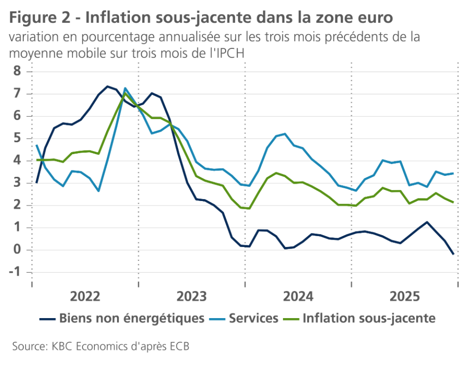 L'inflation semble donc être de nouveau sur la bonne voie pour se refroidir. Toutefois, cela reste principalement dû aux mouvements erratiques des prix de l'énergie. L'inflation de base, quant à elle, reste tenace. Depuis mai 2025, l'inflation de base a toujours été de 2,3% ou 2,4%. L'analyse de la dynamique à court terme de l'inflation de base montre qu'après une poussée temporaire durant les mois d'été, l'inflation des biens s'est fortement ralentie au cours du dernier trimestre. Mais pour l'inflation des services, la dynamique des derniers mois de 2025 a même été légèrement plus forte que durant les mois d'été (voir figure 2).