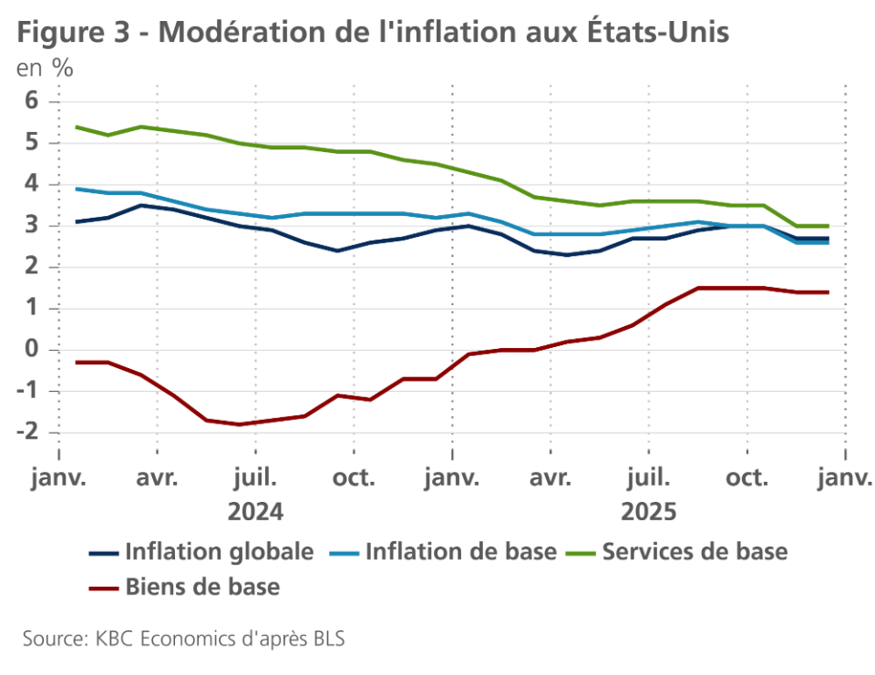 - L'inflation américaine a dépassé son pic. En décembre, l'inflation globale est restée inchangée à 2,7% en glissement annuel, tandis que l'inflation de base s'est ralentie, passant de 2,7% à 2,6%. L'inflation liée au logement et à l'alimentation a été élevée, tandis que l'inflation des services de base (hors logement) a été modeste. Les prix des biens sont restés inchangés, grâce à une baisse des prix des voitures et des camions d'occasion. Les autres composantes des biens (sensibles aux droits de douane) ont encore enregistré des hausses importantes. Nous prévoyons maintenant une inflation moyenne de 2,6% et 2,4% en 2026 et 2027, respectivement.