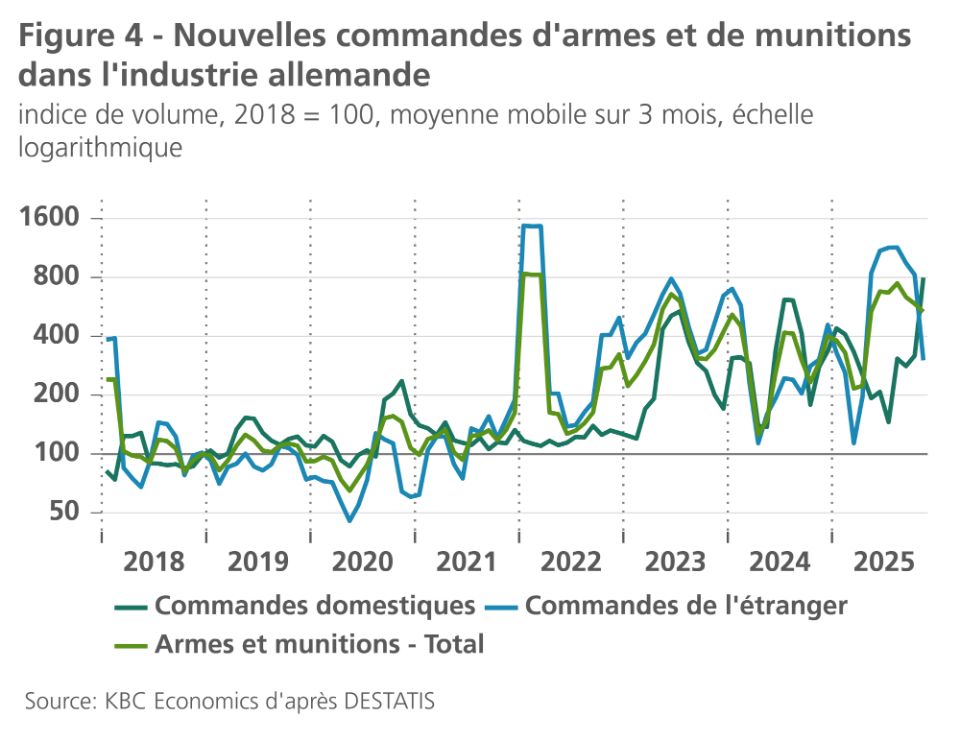 C'est ce que montre l'analyse des commandes par sous-secteur industriel (voir figure 4). Les nouvelles commandes des producteurs d'armes et de munitions ont été presque huit fois supérieures à la moyenne de 2018 au cours des trois mois précédant novembre 2025, selon les données de Destatis, l'office statistique allemand. En particulier, les commandes nationales ont augmenté au cours du second semestre 2025, tandis que les commandes en provenance de l'étranger ont légèrement diminué. (En outre, il convient de noter qu'une partie importante de la forte augmentation des commandes dans l'industrie de l'armement remonte à la période qui a suivi l'invasion de l'Ukraine par la Russie en février 2022). En revanche, dans les secteurs manufacturiers traditionnels de l'Allemagne, qui représentent évidemment une part beaucoup plus importante de l'industrie allemande dans son ensemble, l'évolution des nouvelles commandes reste plutôt faible, à un niveau bien inférieur à celui de 2018 : dans l'industrie automobile, par exemple, elle dépasse largement les 10% et dans l'industrie chimique, elle avoisine même les 25%.