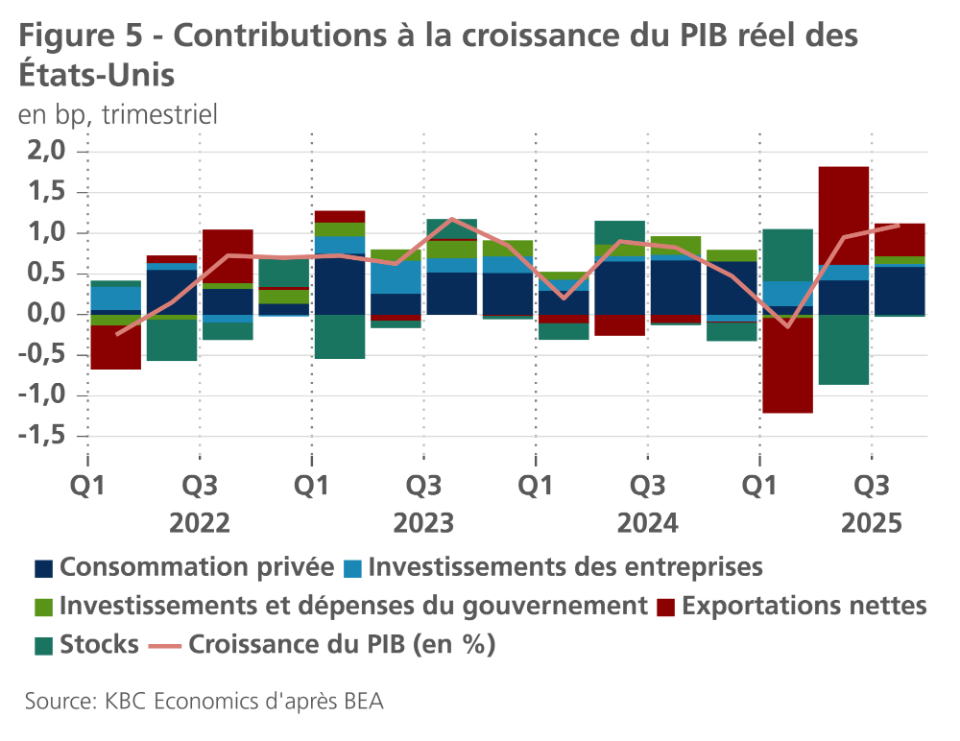 Malgré l'augmentation des droits de douane imposés à la plupart des importations, l'économie américaine continue de surperformer. Au troisième trimestre 2025, l'économie a connu une croissance impressionnante de 1,1% en glissement trimestriel (voir figure 5). Ce chiffre élevé est principalement dû aux dépenses de consommation, qui ont contribué à hauteur de 0,6 point de pourcentage à la croissance globale. Comme l'indiquent les enquêtes de consommation, la croissance est alimentée par les plus hauts revenus, qui ont connu une croissance rapide de leur richesse ces dernières années. Les exportations nettes ont également apporté une contribution importante (en partie grâce à l'augmentation des exportations), bien que cela ait été partiellement compensé par une croissance négative des stocks. L'investissement fixe a été plus faible, les investissements résidentiels ayant à nouveau diminué.