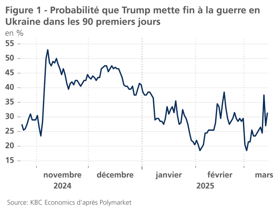 Les négociations de paix sur l'Ukraine pèsent sur les marchés de l'énergie. Après la libération par la Russie d'un prisonnier américain, Marc Fogel, Donald Trump s'est entretenu par téléphone avec Vladimir Poutine pour entamer des négociations sur un éventuel accord de paix. Les délégations américaine et russe se sont ensuite rencontrées à Riyad pour améliorer les relations bilatérales et négocier la fin de la guerre en Ukraine. Les États-Unis semblent déjà avoir fait d'importantes concessions à la Russie. En effet, dans un récent discours à l'OTAN, le secrétaire américain à la défense, Pete Hegseth, a déclaré qu'il était "irréaliste" que l'Ukraine revienne à ses frontières internationales et a indiqué que l'Ukraine ne serait pas admise au sein de l'OTAN. Cependant, plusieurs obstacles se dressent sur la voie d'un accord de paix. La Russie ne semble pas avoir fait de concessions significatives jusqu'à présent. En outre, les relations diplomatiques entre l'Ukraine et les États-Unis se sont considérablement détériorées à la suite de la visite du président Zelensky à la Maison Blanche et de son échange tendu avec Donald Trump et JD Vance. Les relations diplomatiques se sont récemment améliorées, les États-Unis et l'Ukraine s'étant mis d'accord sur une proposition de cessez-le-feu (la Russie n'a pas encore répondu). Les marchés de paris considèrent désormais qu'il y a de plus en plus de chances qu'un accord de paix global soit bientôt conclu (voir figure 1).