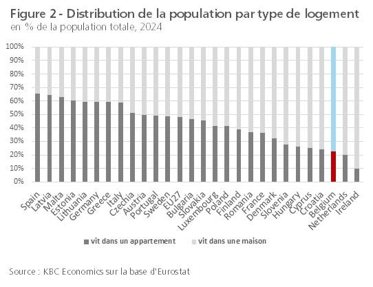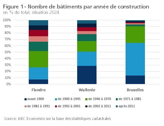 La figure 1 montre la répartition du parc immobilier dans les trois Régions belges en fonction de l'année de construction sur la base des statistiques cadastrales. L'âge des bâtiments varie fortement d'une Région à l'autre, mais l'immobilier est en moyenne très ancien. En Flandre, 66% des bâtiments ont été construits avant 1981. En Wallonie et à Bruxelles, la proportion atteint respectivement 78% et 93%. Une grande partie d'entre eux n'a pas encore été rénovée du point de vue énergétique. Seuls 8,0%, 5,5% et 1,4% des bâtiments dans les trois Régions respectives sont relativement récents, c'est-à-dire érigés après 2011. Outre l'âge moyen du parc immobilier, la Belgique compte beaucoup plus de maisons individuelles, souvent grandes et non attenantes, que les autres pays européens, où l'habitat collectif dans un immeuble à appartements est plus courant (voir figure 2).