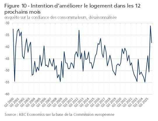 Outre les chiffres concrets, il existe également des informations sur la volonté des ménages de rénover, basées sur des enquêtes. Ainsi, l'enquête sur la confiance des consommateurs de la Commission européenne comprend une question sur l'intention des personnes interrogées d'améliorer leur logement au cours des 12 prochains mois (voir figure 10). Là encore, il peut s'agir d'une rénovation énergétique, mais aussi d'autres améliorations de la qualité du logement (nouvelle salle de bain ou cuisine, peinture, etc.). Il convient donc d'interpréter ces chiffres avec prudence. Cet indicateur, disponible sur une base trimestrielle, a affiché un mouvement remarquablement positif au second semestre 2025. Une ventilation par âge montre que l'intention la plus élevée d'améliorer le logement concerne principalement les 30-49 ans et, dans une bien moindre mesure, les plus de 50 ans.
