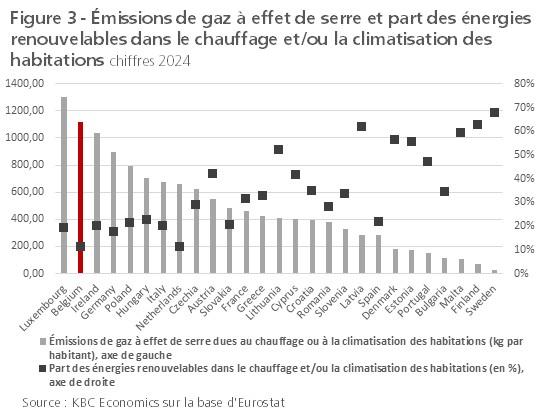 L'une des conséquences est que les logements en Belgique sont parmi les plus gourmands en énergie de toute l'Union européenne (UE27). Malgré l'amélioration constatée ces dernières années, la Belgique se classe au deuxième rang de l'UE27 (après le Luxembourg) en termes d'émissions de gaz à effet de serre par habitant dues au chauffage ou à la climatisation des habitations (voir figure 3). Même si on limite la comparaison aux pays de l'UE ayant un climat similaire, la Belgique n'obtient pas de bons résultats. La Belgique affiche également une performance assez faible en ce qui concerne le pourcentage d'habitations chauffées ou refroidies à l'aide d'énergie renouvelable (panneaux et chauffe-eau solaires, pompe à chaleur, géothermie,...). En Belgique, cette part est de 10% à peine, contre environ un quart dans l'ensemble de l'UE27.