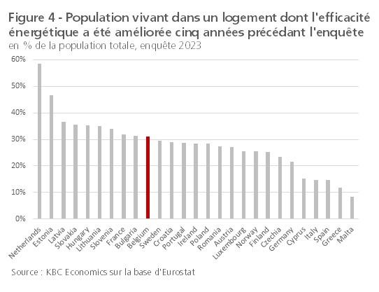 Néanmoins, l'efficacité énergétique des habitations en Belgique s'améliore. L'ampleur de ce phénomène est même légèrement supérieure à la moyenne de l'UE27, ce qui réduit l'écart encore assez marqué. Ainsi, entre 2008 et 2024, les émissions de gaz à effet de serre liées au chauffage ou à la climatisation des logements ont diminué deux fois plus vite en Belgique (de 659 kg par habitant) que dans la moyenne de l'UE27 (de 307 kg par habitant). Par ailleurs, selon une enquête d'Eurostat, 31% des Belges vivaient en 2023 dans un logement dont l'efficacité énergétique avait été améliorée au cours des cinq années précédant l'enquête. Dans l'ensemble de l'UE27, ce pourcentage était inférieur à 25% (voir graphique 4). Ces chiffres doivent cependant être relativisés. Ainsi, la baisse des émissions est en partie due au remplacement du mazout par le gaz naturel, ce qui n'est pas une solution durable à long terme. En outre, certains chiffres de l'enquête Eurostat peuvent ne concerner que des premières interventions limitées (p.ex. isolation des combles, installation de panneaux solaires) plutôt qu'une rénovation complète.